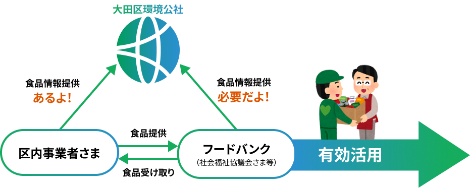 当公社が区内事業者さまに食品の情報をご提供いただき、フードバンクさまにその情報をご提供します。